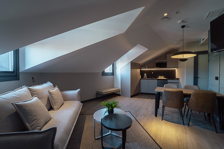 Los apartamentos, de decoración elegante y funcional, combinan una paleta de tonos serenos con elementos originales restaurados, dando lugar a espacios atemporales y llenos de carácter.